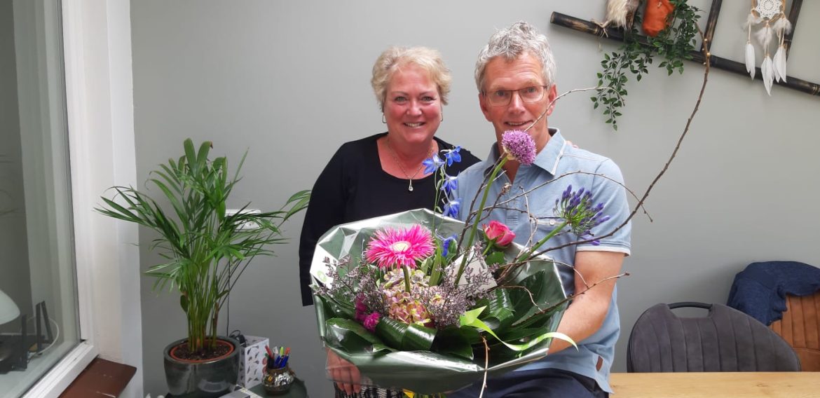 Onlangs had onze voorzitter Wim zijn laatste officiële werkdag, maar op die dag was hij ook precies 40 jaar getrouwd met zijn Noëlle. Mia bracht namens de vereniging nog een mooi boeket. Namens alle EMM-ers proficiat en nog vele gelukkige jaren samen!