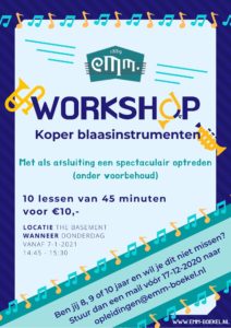 Na de kerstvakantie bieden we weer workshops aan voor de leerlingen van onze basisscholen. Zo kunnen ze kiezen voor ‘klarinet en blokfluit’, ‘koperinstrumenten’ of ‘slagwerk’. Als gevolg van de coronamaatregelen kunnen we dit niet op school doen, maar worden de bijeenkomsten in de Basement gehouden. Voor een kleine bijdragen van €10,- worden er 10 lessen van 45 minuten verzorgd door onze eigen docenten zodat er een goed beeld betreffende het gekozen instrument. Uiteraard hopen we dat we hiermee weer een aantal kinderen enthousiast krijgen voor onze vereniging. We ontdekken steeds beter hoe goed muziek maken is voor de ontwikkeling van kinderen, en daarbij is EMM ook een hele gezellige vereniging die in ons dorp niet weg te denken is.